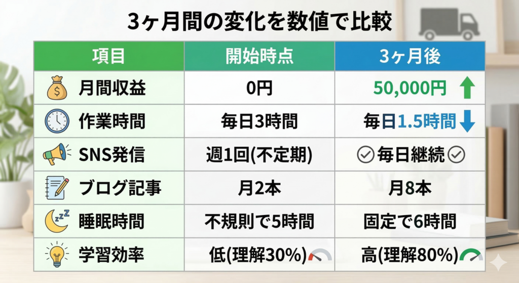 特筆すべきは、作業時間を半分に減らしながら、会社以外の収入源を作れた点だと思います。これは「正しい情報源から学んで、無駄を削ぎ落とした」結果だと確信しています。