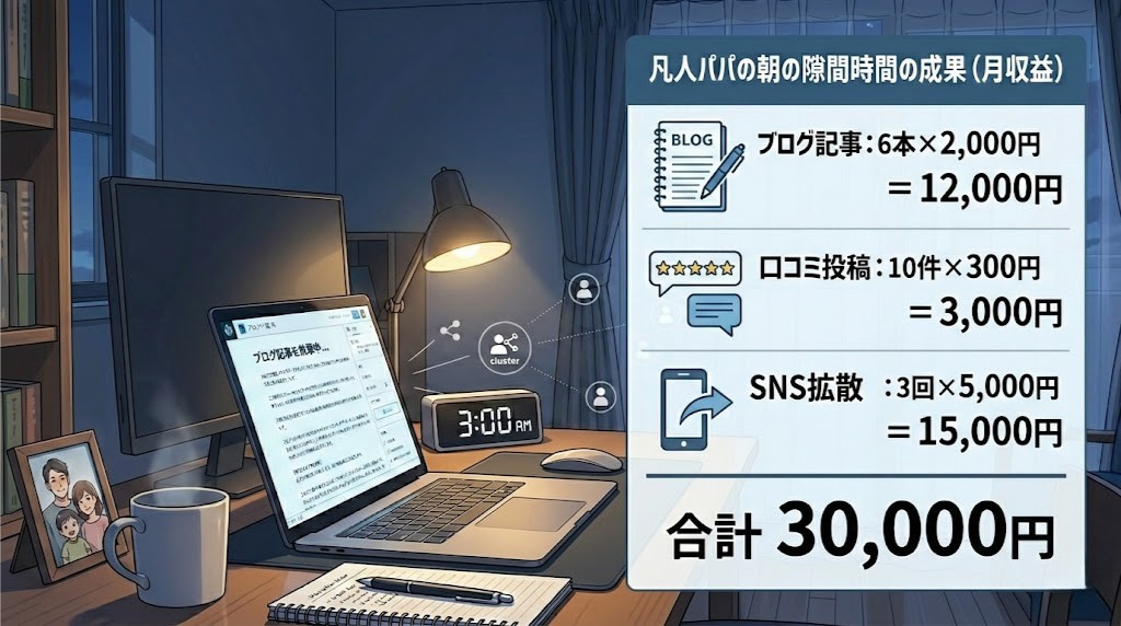 「月数百万」という実績を持つ方もいるそうですが(公式サイト記載)、凡人パパの僕には月3万円が最初のゴールでした。朝の隙間時間で無理なく届く現実的な数字です。