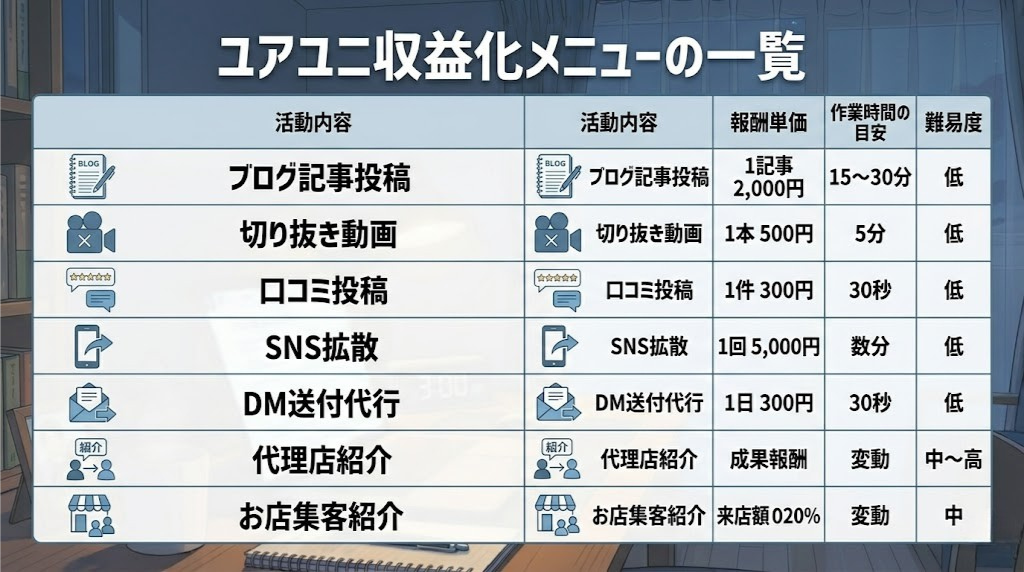 ユアユニ収益化メニューの一覧