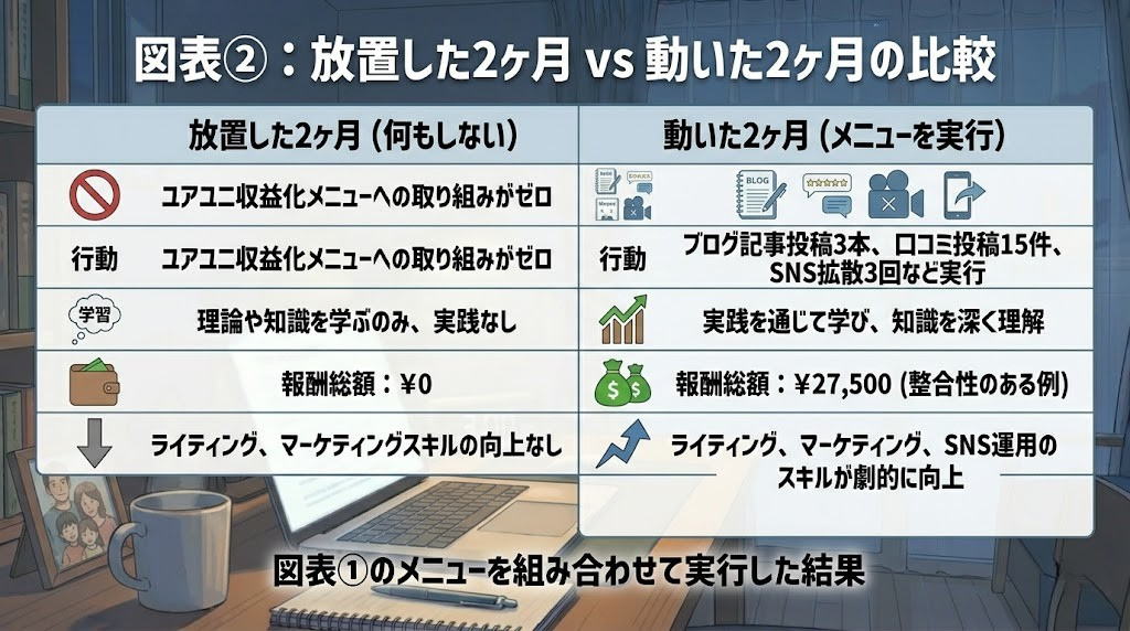 ユアユニに入学してから2ヶ月、毎朝動画を見て学んでいました。マーケティング・ライティング・SNS設計。少しずつ知識は積み上がっていた。でも収益はゼロのままでした。