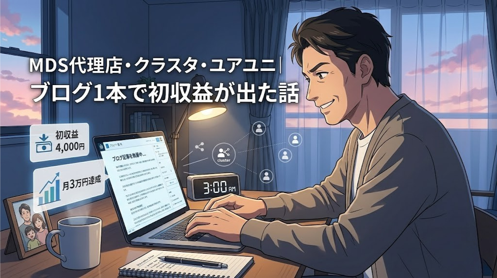 ユアユニのMDS代理店・クラスタ制度は「学んだことをそのまま収益にする」設計です。ブログ・口コミ・SNS拡散など、朝の隙間時間でできる活動から始められます。